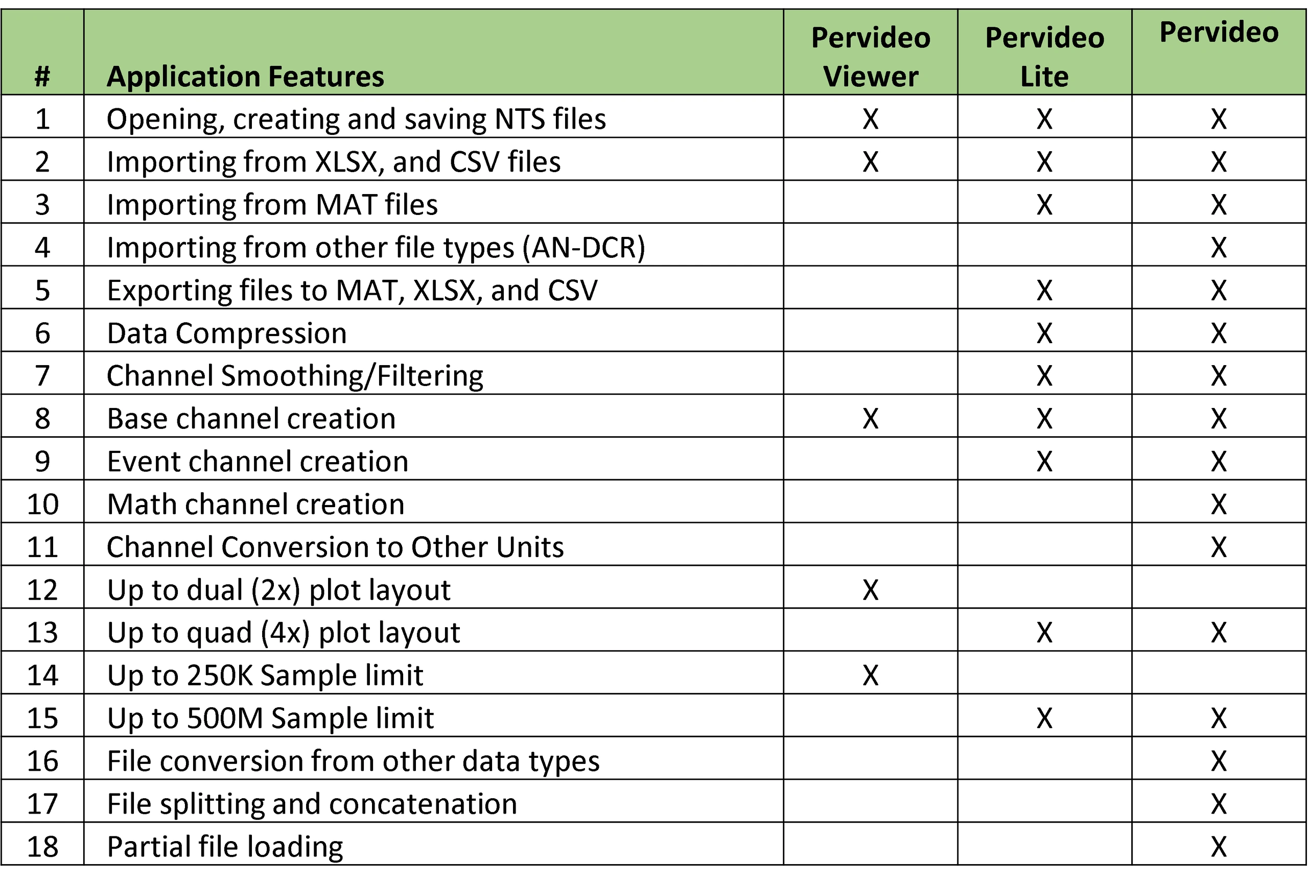 Pervideo a family of data analysis applications that close some of the gaps between spreadsheet style analysis solution and open-source or custom software solutions. The software provides a simple solution to basic time series data analysis problems. It provides numerical time series data analysis features including channel-to-channel math, signal filtering, and data set concatenation functions.